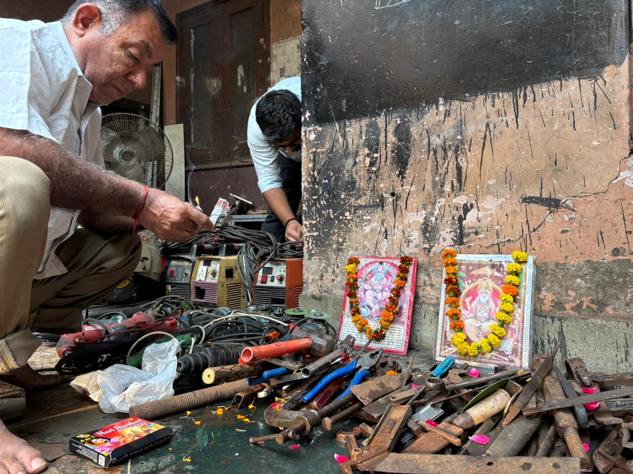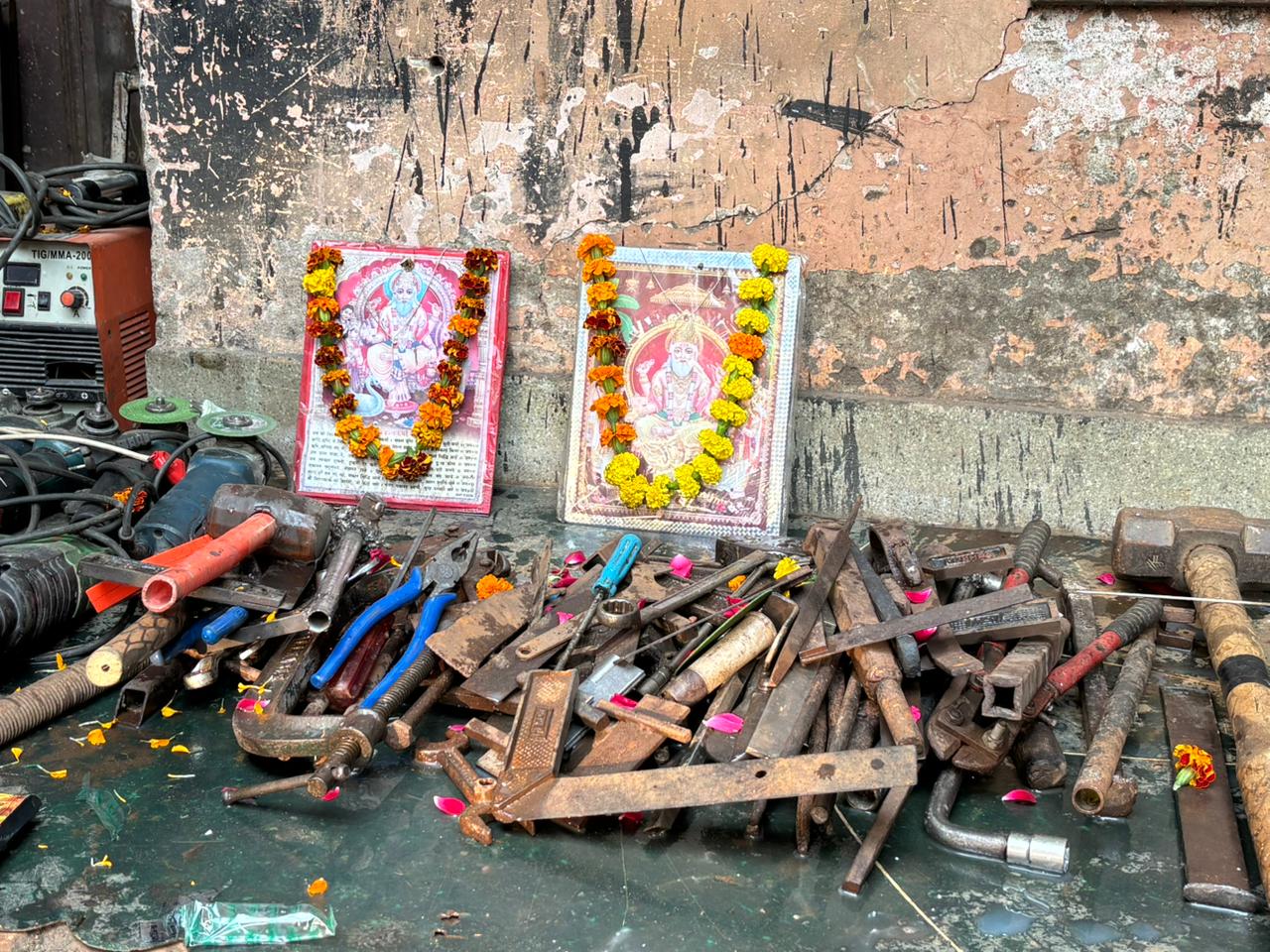 1. मशीनों और औजारों को अच्छी तरह साफ कर भगवान विश्वकर्मा की मूर्ति के सामने सजाया जाता है।