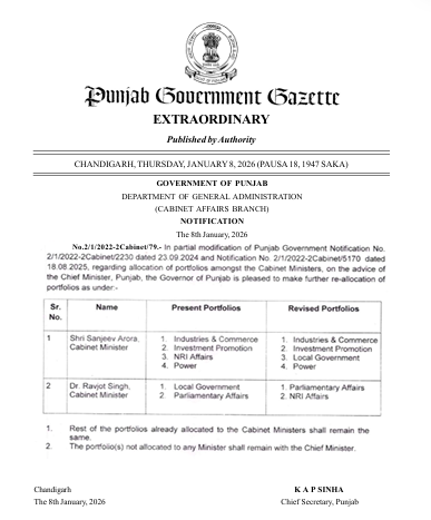 चंडीगढ़, 10 जनवरी,2026ः पंजाब सरकार की ओर से मंत्रियों के विभागों के बंटवारे की अधिसूचना जारी कर दी गई है। बता दें कि संजीव अरोड़ा को चार विभाग दिए गए हैं जबकि डॉ. रवजोत को दो विभाग मिले है।