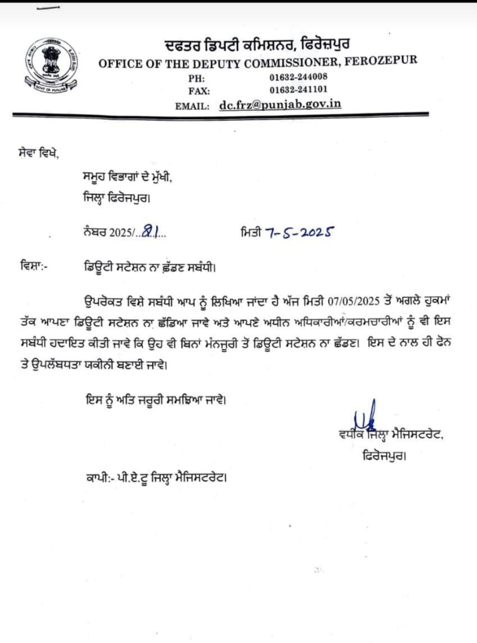 7 मई 2025 : जिला फिरोजपुर के अधिकारियों और कर्मचारियों को अब अपने ड्यूटी स्टेशन को बिना अनुमति छोड़ने की इजाजत नहीं होगी। जिला मजिस्ट्रेट ने 7 मई 2025 को यह आदेश जारी किया है, जिसमें कहा गया है कि अगले आदेश तक किसी भी अधिकारी या कर्मचारी को अपने ड्यूटी स्टेशन से बाहर जाने की अनुमति नहीं होगी। इस आदेश का पालन सुनिश्चित करने के लिए, जिला प्रशासन के सभी अधिकारियों को फोन पर उपलब्ध रहने की भी हिदायत दी गई है।
